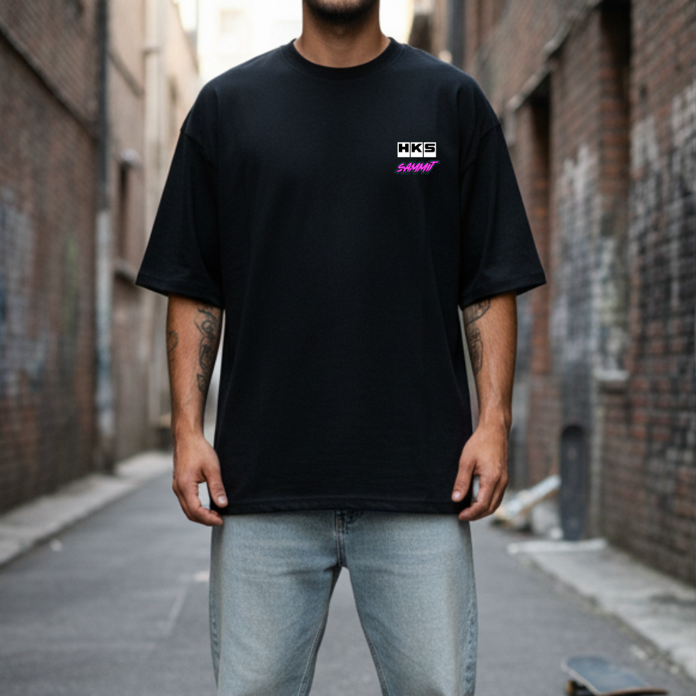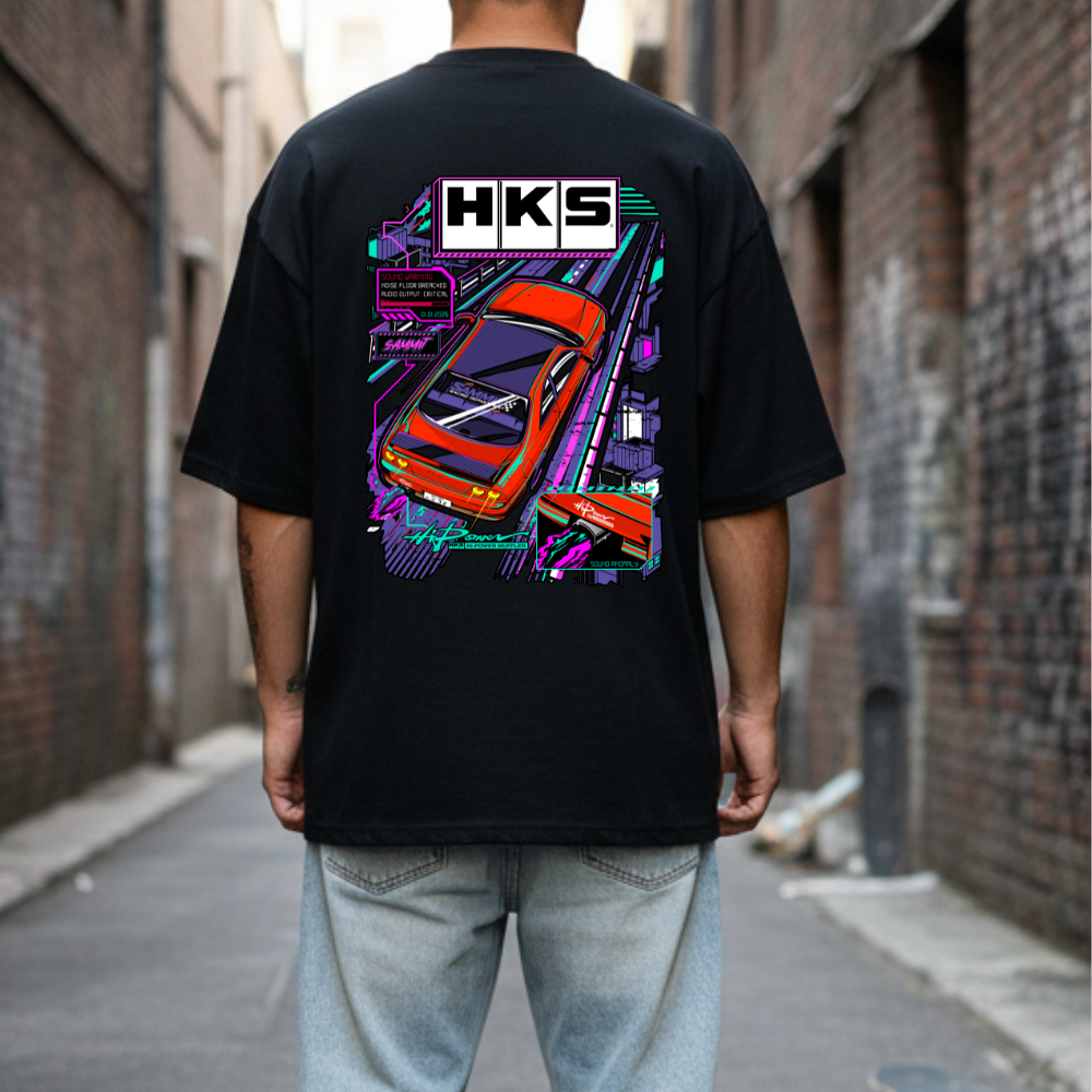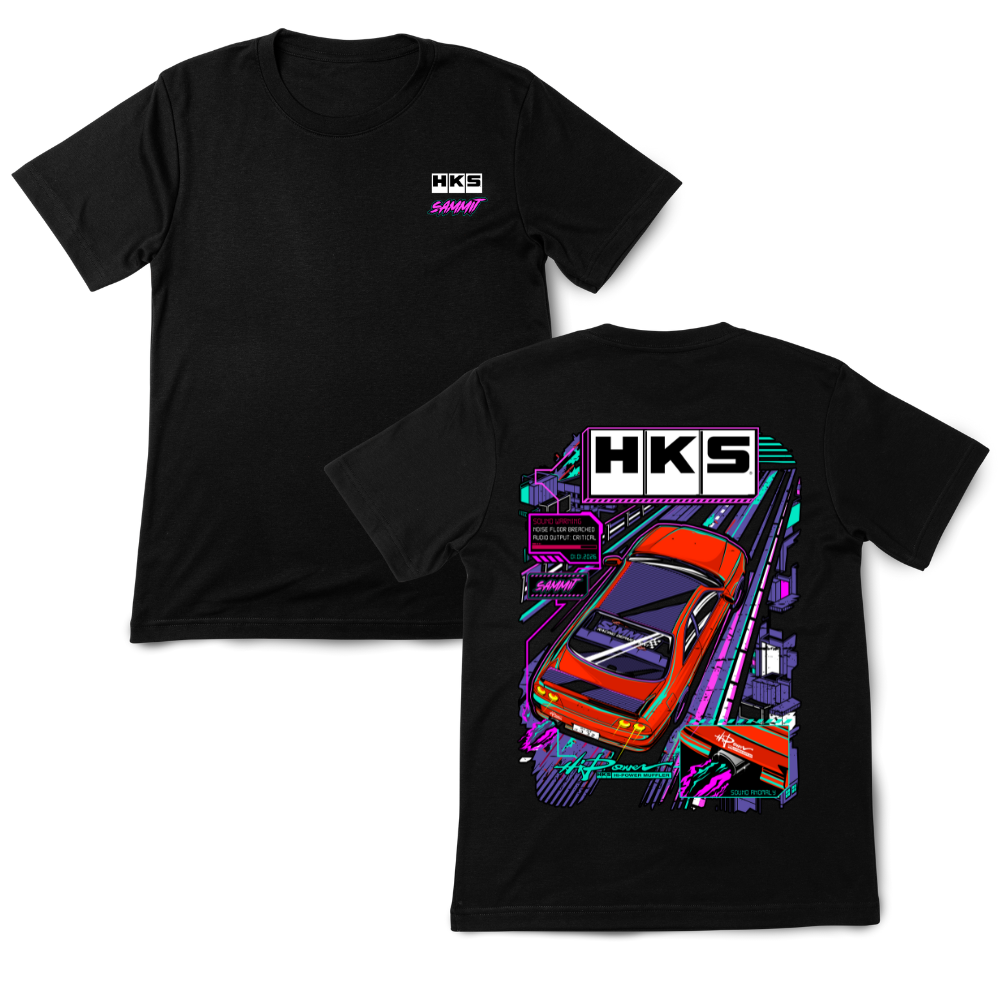HKS x SAMMIT official collab tee featuring a bold neon, retro-futuristic car graphic inspired by late-night street runs – printed on a black tee for a clean, high-contrast look.