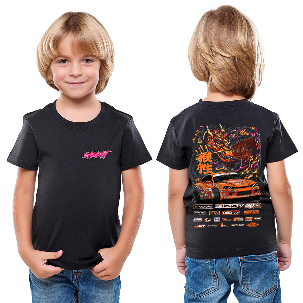 The KIDS TEAM SAMMIT FD SUPPORT Shirt 2025 features Sammit’s iconic orange S15 drift car in a bold, collectible cotton tee for young fans.